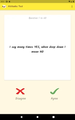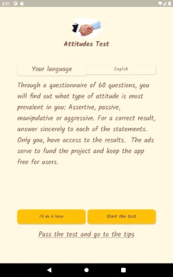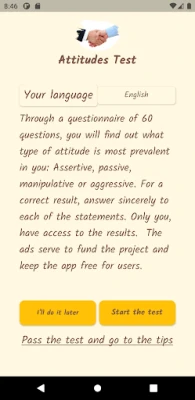 There are 4 main attitudes in human relationships: Passive, aggressive, manipulative and assertive attitude. Through a 60-question quiz, this app will help you figure out what your attitude is most prevalent.