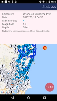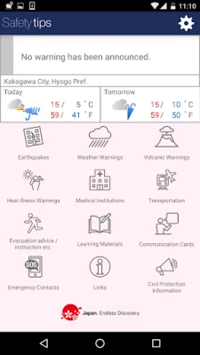 This Application notifies a user with EEW, Tsunami Warnings, Volcanic Warnings, Weather Warnings, Heat illness Warnings and Civil Protection Information issued in Japan. It is a free application developed under the supervision of Japan Tourism Agency.