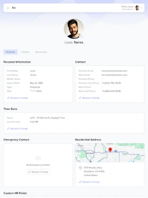 Personal Information: Easily review your personal details, such as contact information, emergency contacts, and banking details for payroll. Keep your information up-to-date and secure.